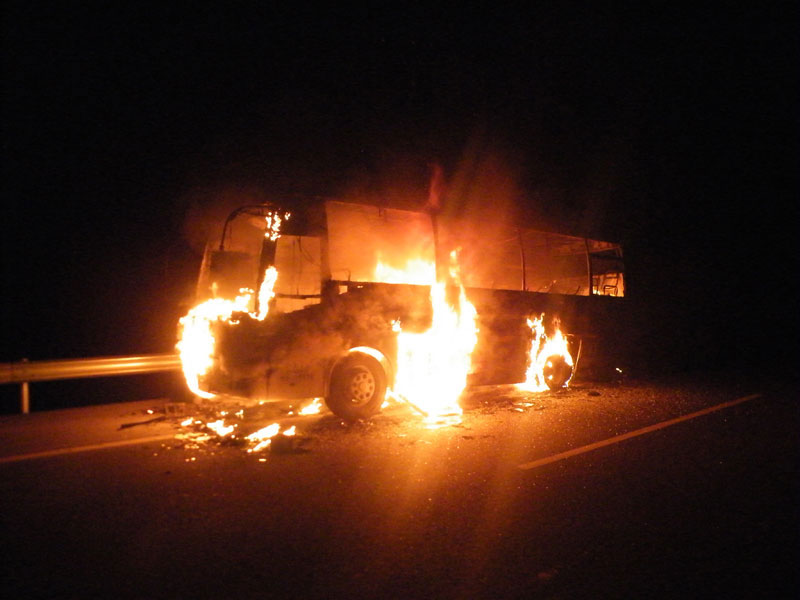7)当公共汽车发生火灾时,由于车上人多,要特别冷静果断,首先应考虑到救人和报警,视着火的具体部位而确定逃生和扑救方法。如着火的部位在公共汽车的发动机,驾驶员应开启所有车门,令乘客从车门下车,再组织扑救火灾。如果着火部位在汽车中间,驾驶员开启车门后,乘客应从两头车门下车,驾驶员和乘车人员再扑救火灾、控制火势。如果车上线路被烧坏,车门开启不了,乘客可从就近的窗户下车。如果火焰封住了车门,车窗因人多不易下去,可用衣物蒙住头从车门处冲出去。
