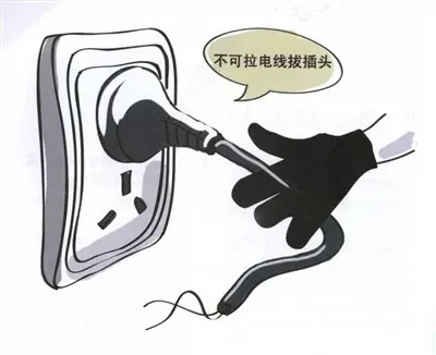 拔插头时不要拽电源线,这样容易把电源线与插头连接的部位拽断,从而发生短路、漏电,引发火灾和触电事故。